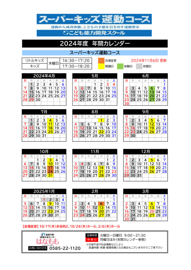 SuperKids 運動コース レッスンカレンダー (11/6更新)