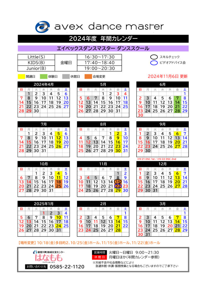 avexdancemaster ダンススクール レッスンカレンダー (11/6更新)