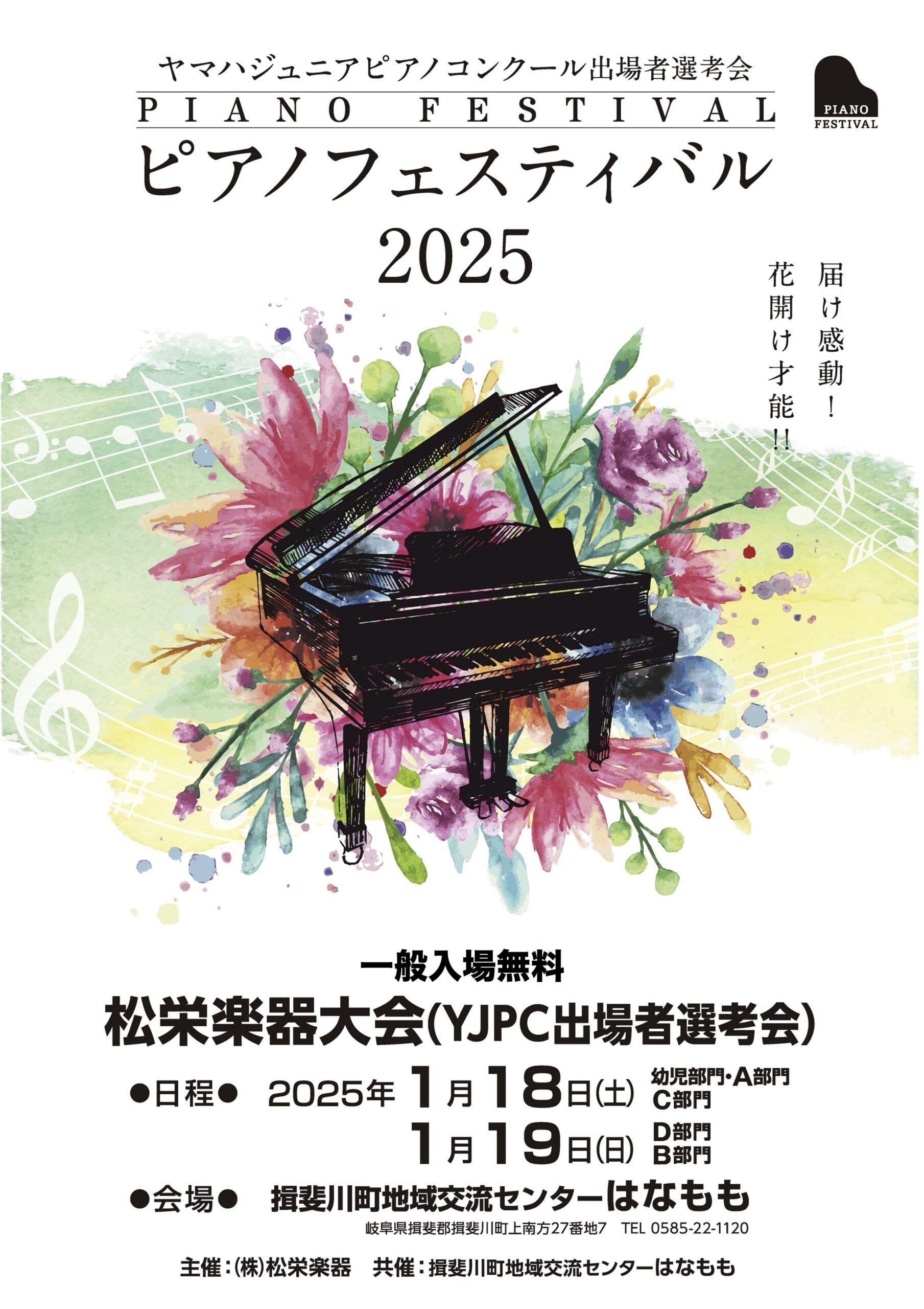 YJPC出場者選考会も兼ねた【ピアノフェスティバル2025】を揖斐川町地域交流センター「はなもも」で開催する事となりました。観覧無料となっておりますので、ぜひこの機会にご来場ください。
