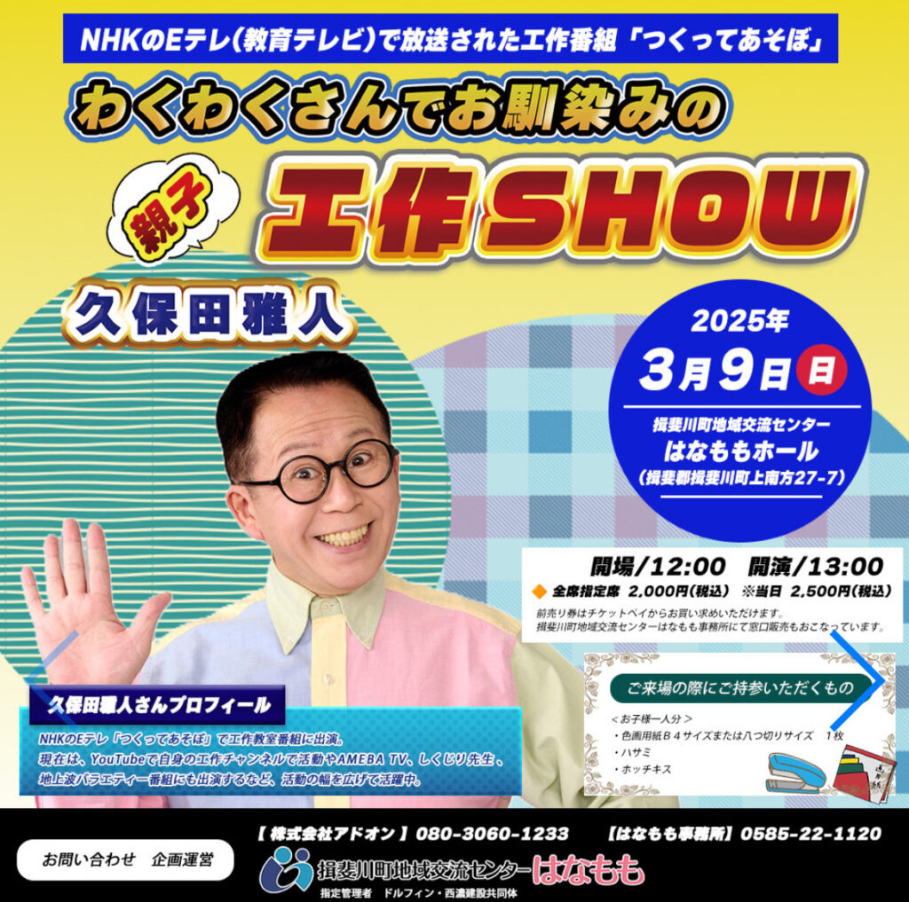 NHK Eテレ(教育テレビ)わくわくさんでお馴染みの久保田雅人さんが、親子の工作showを開催します。わくわくさんを見て育った方も、今では育児をされる世代となり、全国各地で行う公演でも懐かしく思われ観覧参加をされる方も大勢みえます。