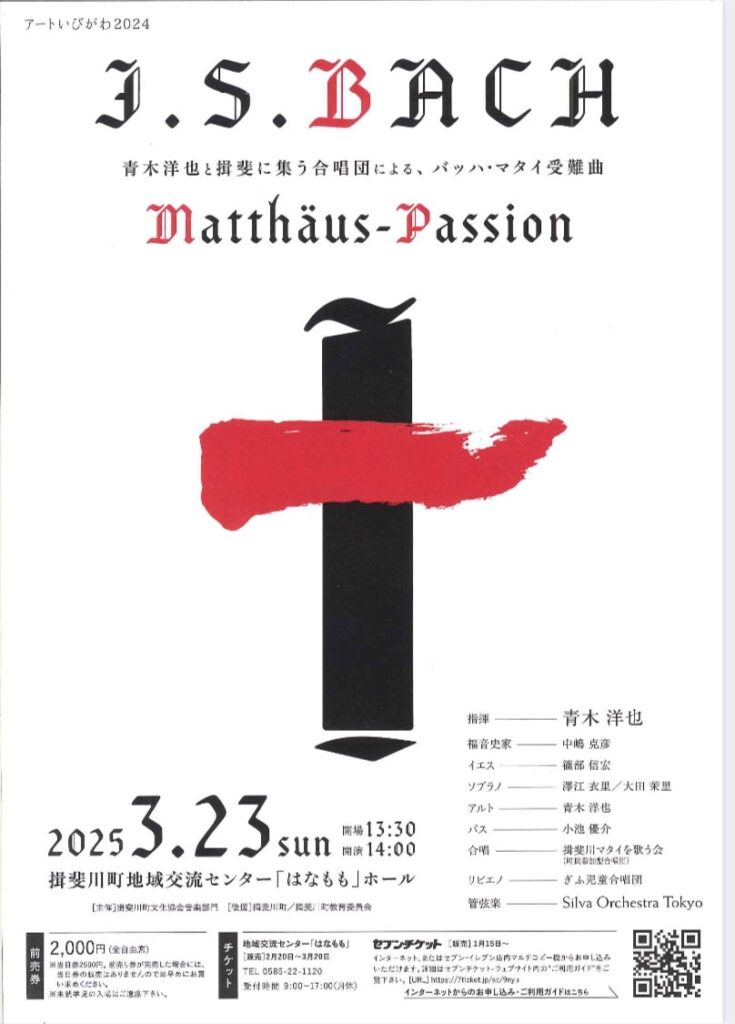 揖斐川町地域交流センター「はなもも」ホールで、青木洋也さんと揖斐に集う合唱団による、バッハ・マタイ受難曲が開催されます。