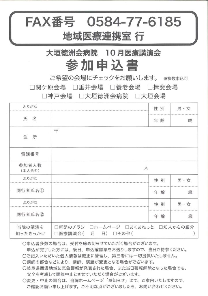 お申し込みは、チラシの裏側のFAX用紙、又は大垣徳洲会病院ホームページのお申し込みフォームよりお申込みください。