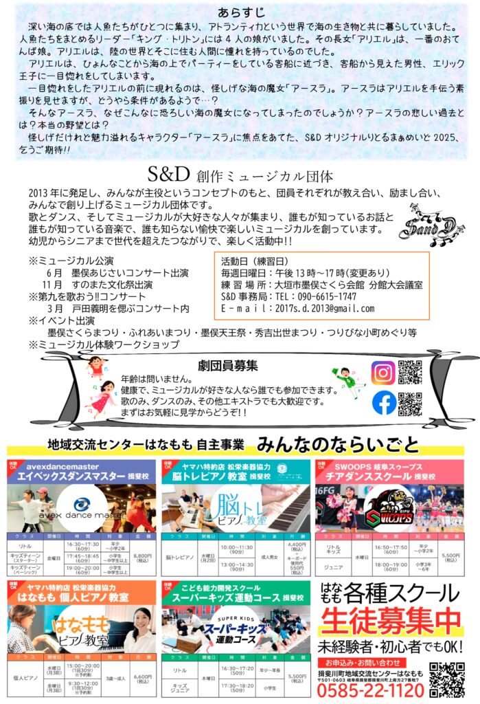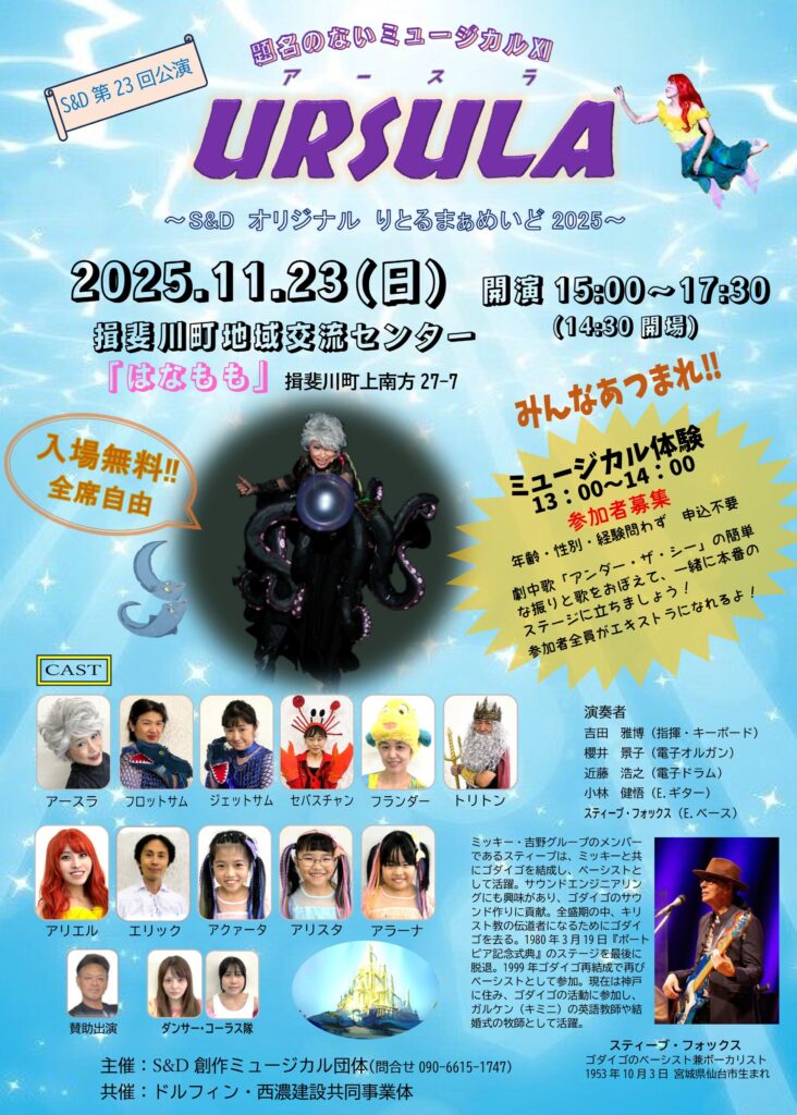 今回のURSULAはリトルマーメイドのS&Dオリジナルバージョンで、今回は特別にどなた様でも参加できるミュージカル体験があります。年齢、性別、経験は不問です。