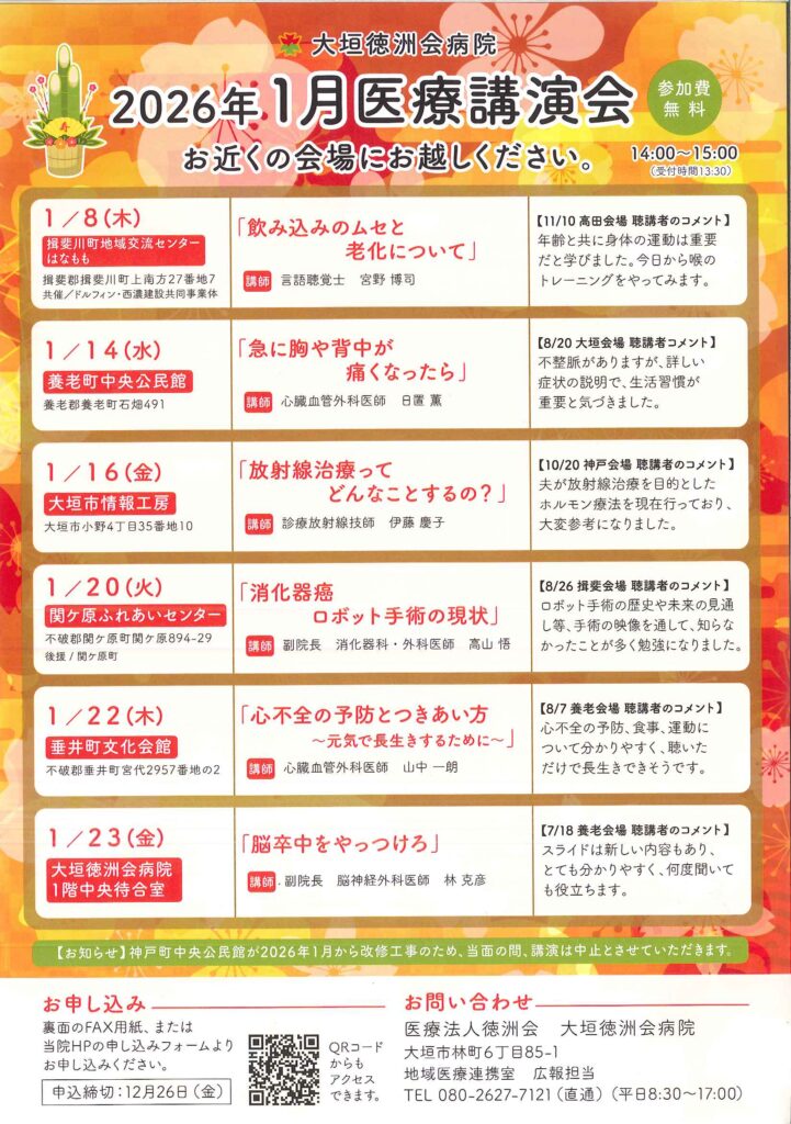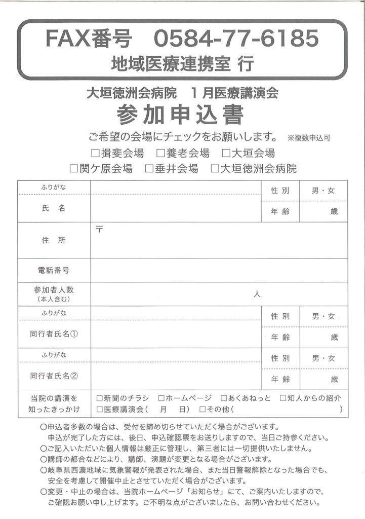 お申し込みは、チラシの裏面のFAX用紙、または大垣徳洲会ホームページのお申込みフォームよりお申し込みください。申込締切:12.26(金)