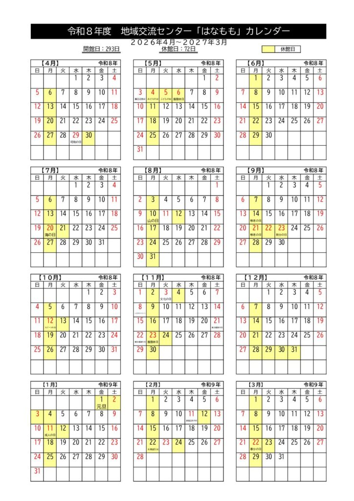 お知らせ 令和8年度 地域交流センター 開館カレンダー 2026年2月3日 2026年4月(令和8年度)からのカレンダーになります。 印刷またはダウンロードをしてご活用ください。 ★地域交流センター配布用カレンダー(R8年度)ダウンロード