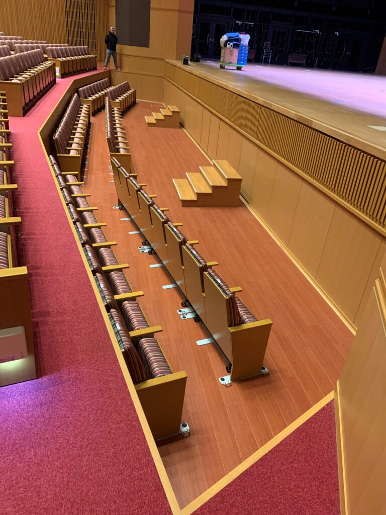 普段は客席として利用されているこのスペースですが、今回のように演奏者が入る場合、床部分を下げて使用することができるのです。演奏の音量が舞台上の歌声とぶつかり過ぎないようにするため、また観客が舞台上の演技に集中できるようにするための設備です。